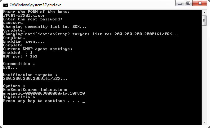 @echo off echo Enter the FQDN of the host: set /p hostname= echo Enter the root password: set /p password= set user=root "C:\Program Files (x86)\VMware\VMware vSphere CLI\bin\vicfg-snmp.pl" --server %hostname% --username %user% --password %password% -c ESX -t 200.200.200.200@161/ESX --enable "C:\Program Files (x86)\VMware\VMware vSphere CLI\bin\vicfg-snmp.pl" --server %hostname% --username %user% --password %password% -show >> c:\ESXi_SNMP.log pause |