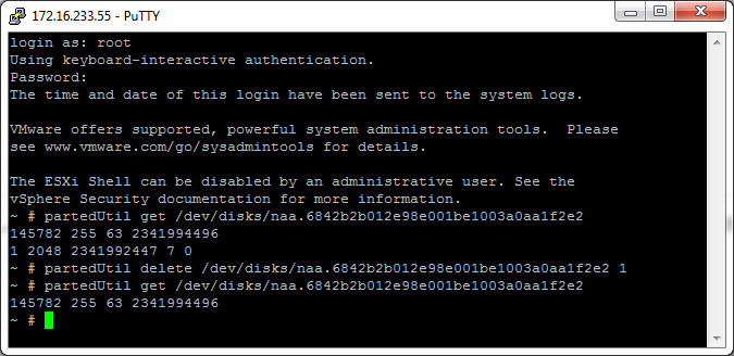partedUtil delete /dev/disks/naa.6842b2b012e98e001be1002b09c03237 1