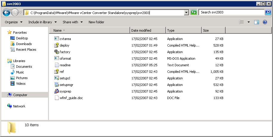 - Copy the contents of deploy.cab to “C:\ProgramData\VMware\VMware vCenter Converter Standalone\sysprep\svr2003” (This folder should be empty before the copy)
