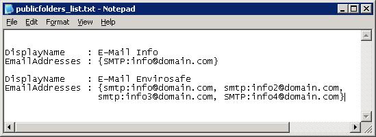 Displays a list of Public Folders & Email addresses output to TXT File (FL = Formats list with full text)